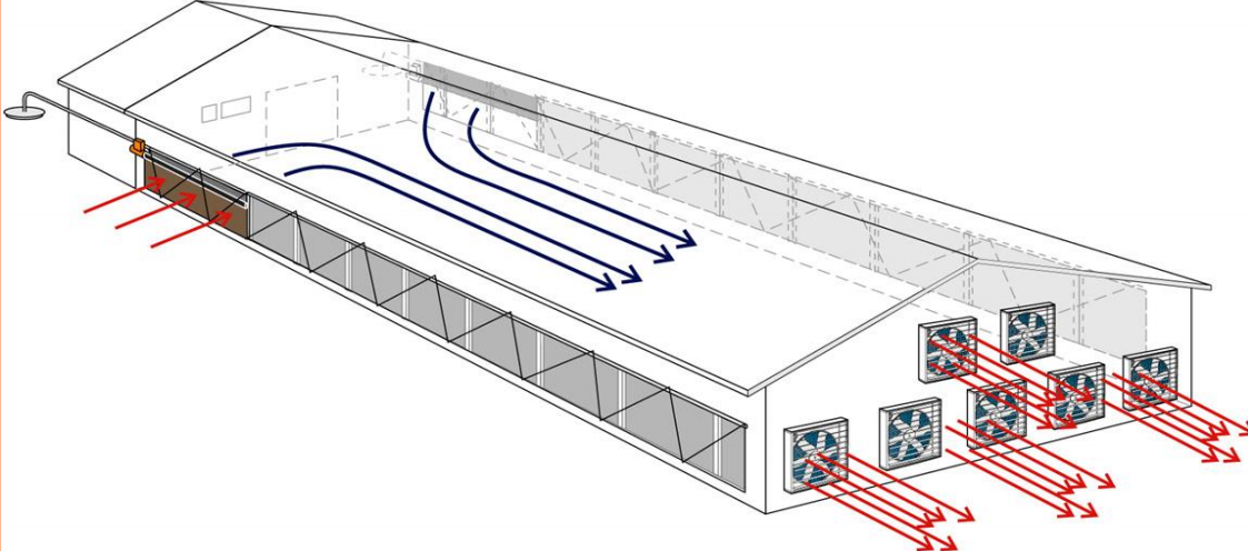 縱向通風:通過風機冷效和濕簾降溫。通風系統(tǒng)的計算應根據(jù)豬只體重,階段以獲得需求的風速。